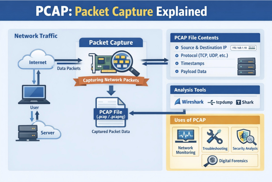 PCAP technology provides deep visibility into network communications and is widely used in networking, cybersecurity, troubleshooting, and digital forensics.
